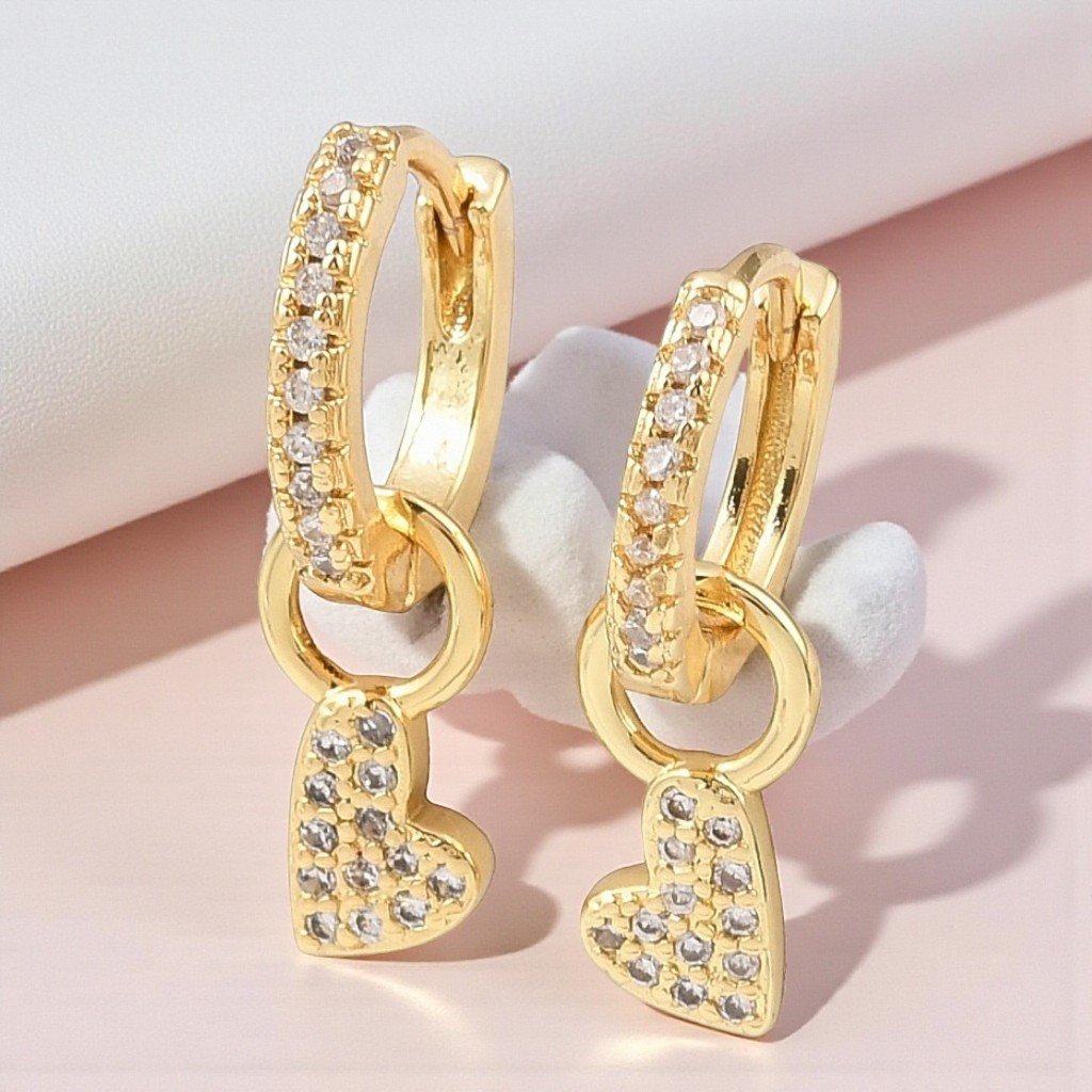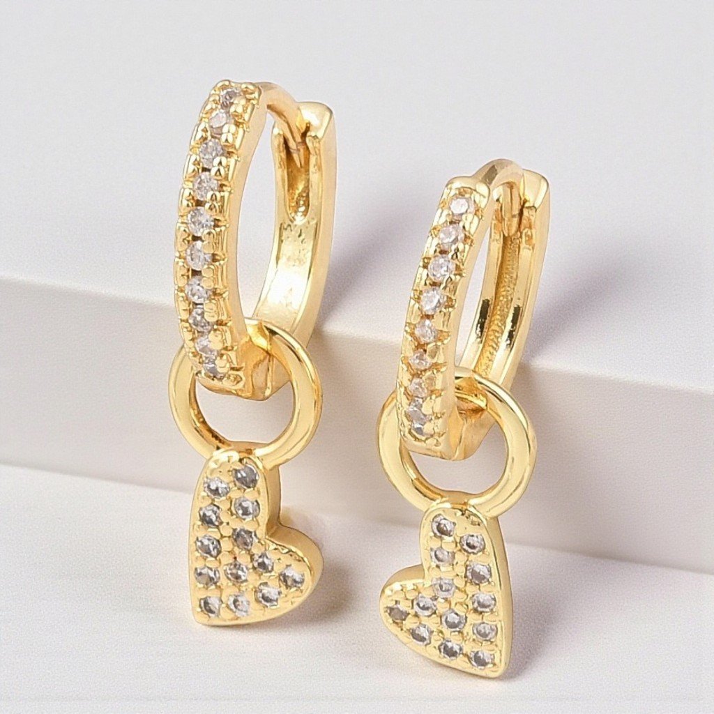 Nežné a žiarivé – tieto zlaté visiace náušnice s motívom srdca a trblietavým čírym zirkónom sú dokonalým doplnkom pre každú ženu, ktorá miluje eleganciu a romantický štýl. Vďaka precíznemu spracovaniu zo šperkárskeho kovu a povrchovej úprave si zachovávajú svoj lesk aj po dlhšom nosení.