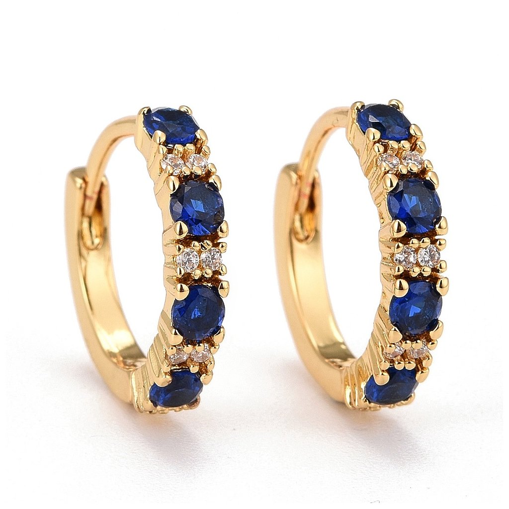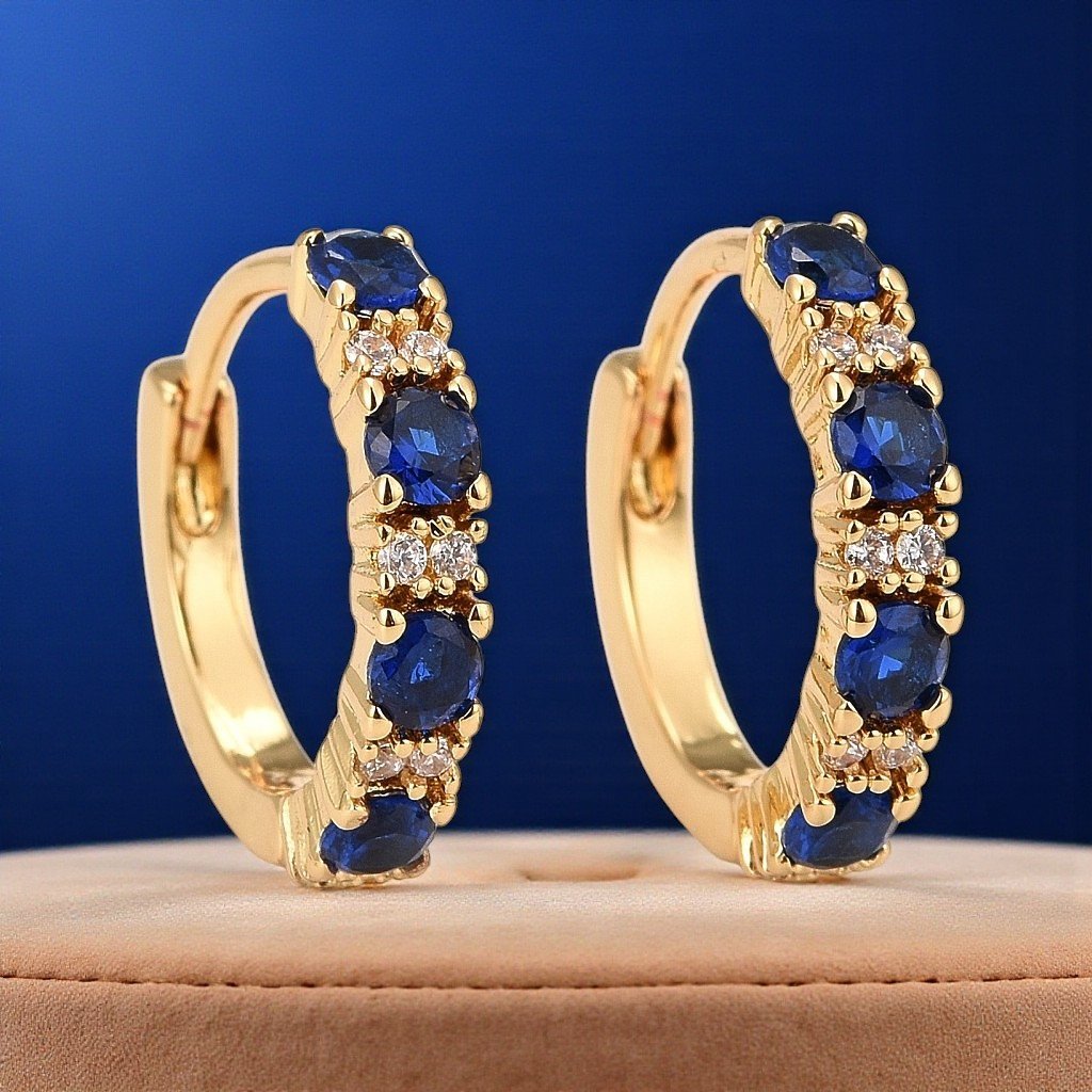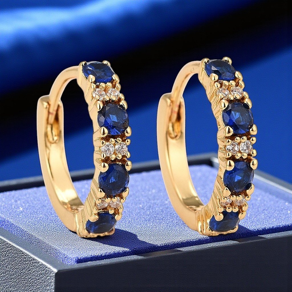Doprajte si nadčasovú eleganciu s týmito zlatými kruhovými náušnicami zdobenými trblietavými modrými zirkónmi. Vďaka precíznemu spracovaniu zo šperkárskeho kovu a pozláteniu pôsobia luxusne, no zároveň sú vhodné na každodenné nosenie. Praktické pántové zapínanie zabezpečuje pohodlie a spoľahlivosť pri každom pohybe.