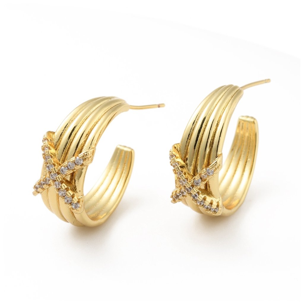 Elegantné náušnice s moderným krížovým dizajnom dodajú vášmu outfitu sofistikovaný nádych. Číre kubické zirkóny sa nádherne lesknú pri každom pohybe a vytvárajú luxusný vzhľad. Náušnice sú vyrobené z kvalitného zlatníckeho kovu, majú polkruhový tvar a povrchovú úpravu pozlátením. Sú bezpečné na nosenie – neobsahujú kadmium ani olovo.