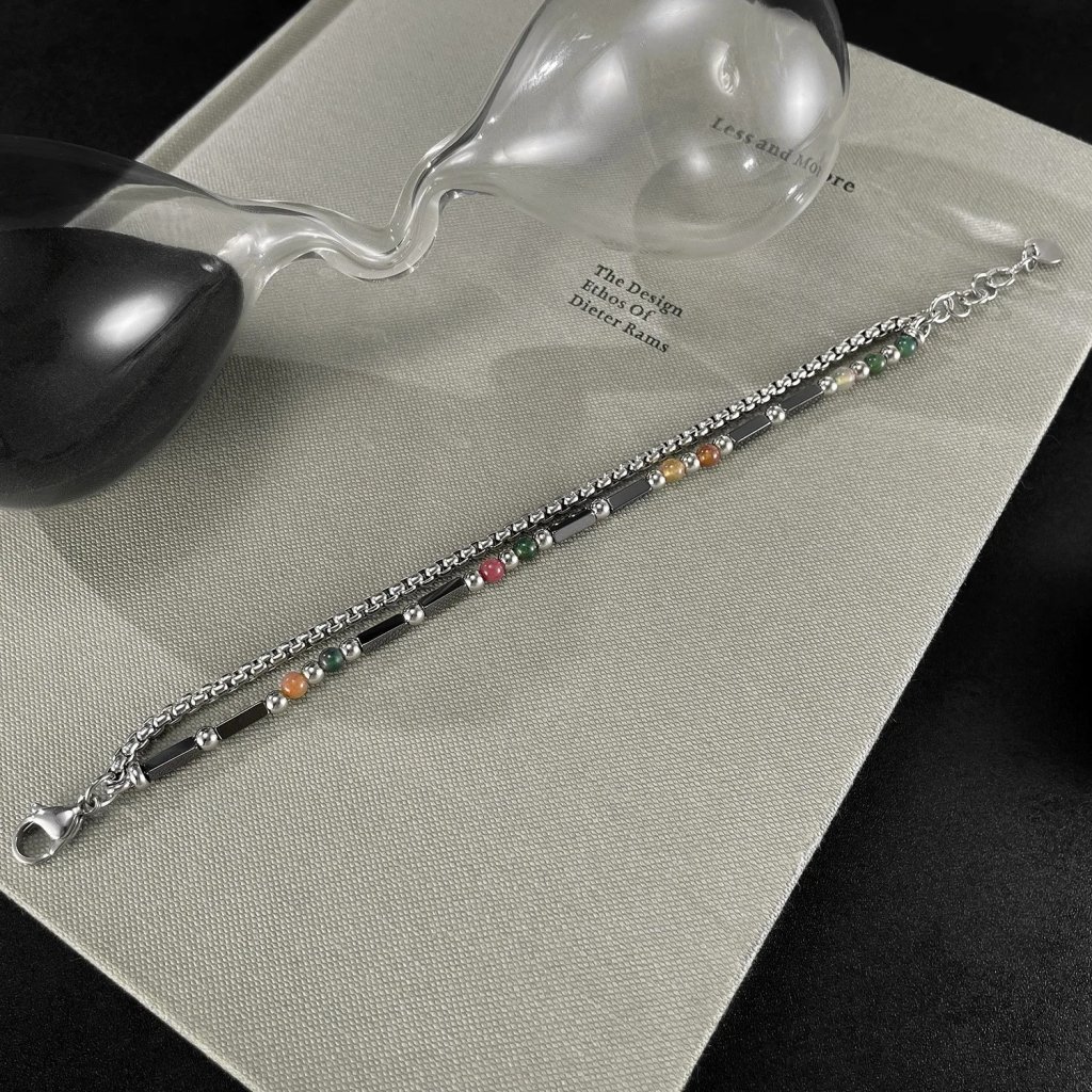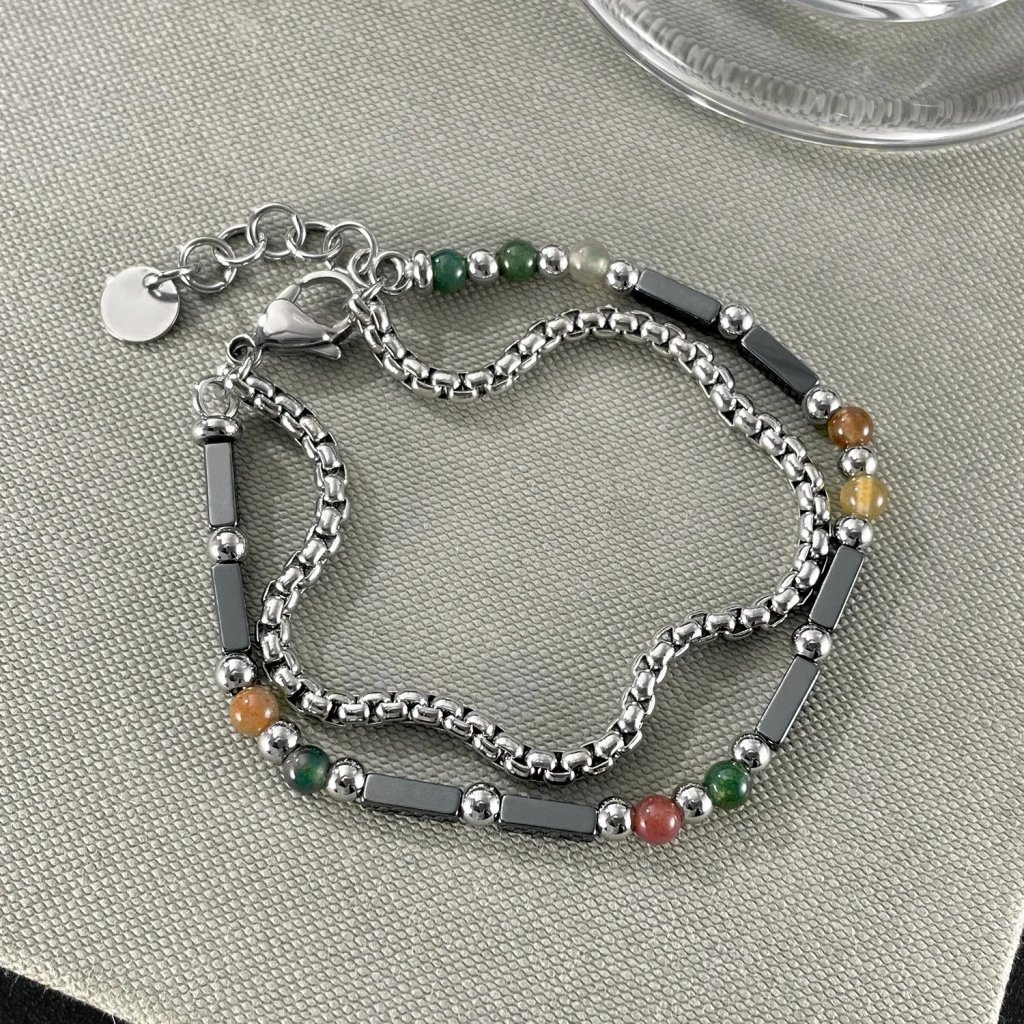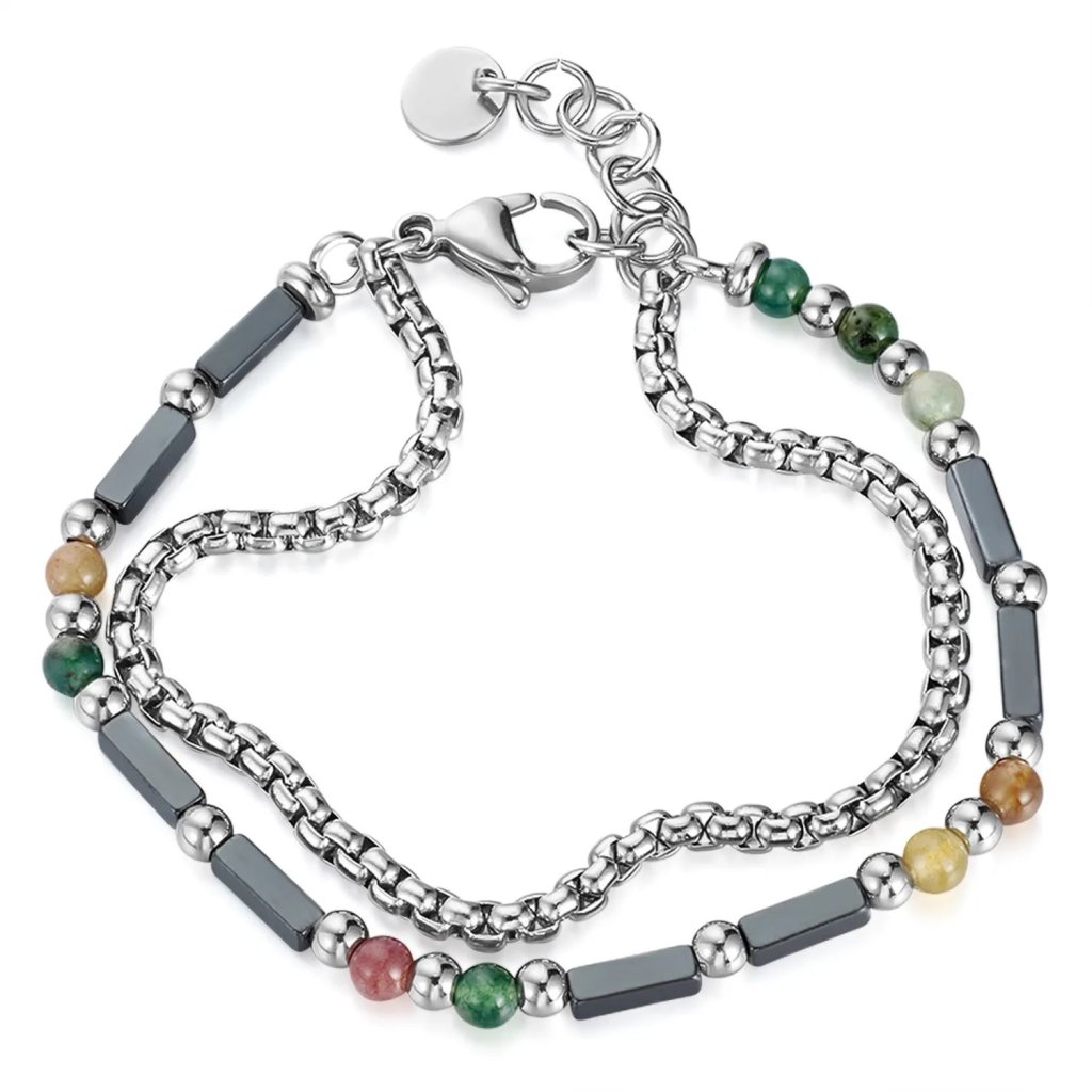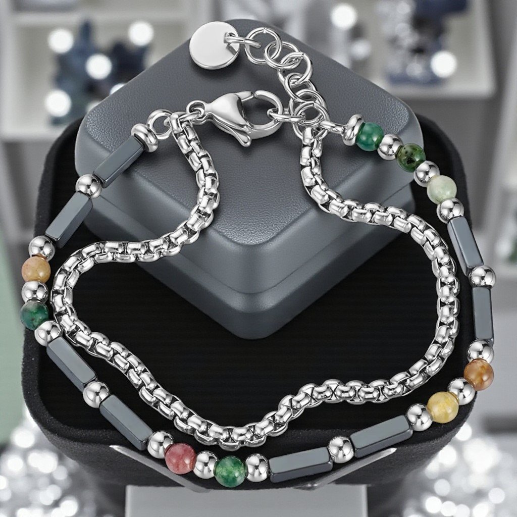 Prvá vrstva je tvorená robustnou retiazkou z kvalitnej chirurgickej ocele, ktorá zaisťuje odolnosť a dlhotrvajúci lesk. Druhá vrstva predstavuje štýlovú kombináciu korálok z prírodného achátu v rôznych zemitých odtieňoch a tmavých valčekov z (pravdepodobne) hematitu, ktoré dodávajú náramku textúru a moderný vzhľad.