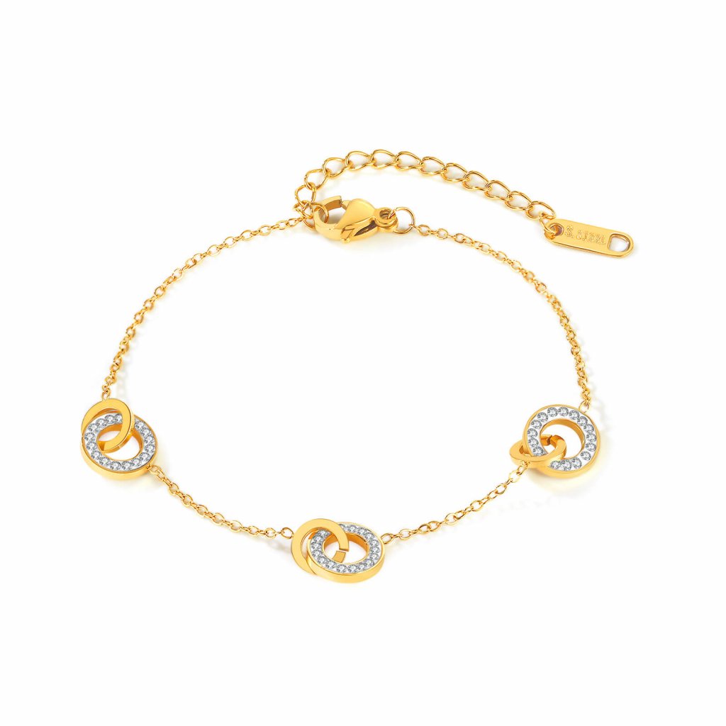 Moderný dámsky náramok spojené kruhy so zirkónmi chirurgická oceľ