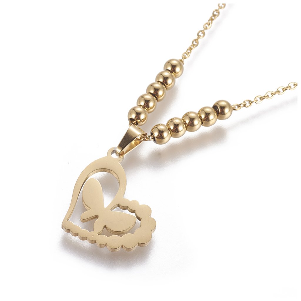 Obľúbená dievčenská súprava motýľ a srdce z chirurgickej ocele. Šperk si zachováva svoju farbu, lesk, je odolný proti sčernaniu a má dlhú životnosť. Chirurgická oceľ má stále vlastnosti, metalickou úpravou bol dosiahnutý antialergický účinok.
