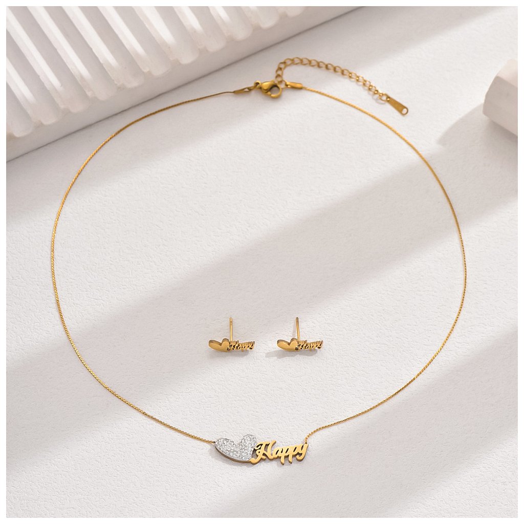 Tento nádherný trojdielny oceľový set šperkov zlatej farby predstavuje dokonalú kombináciu módy, jednoduchosti a elegancie. Set obsahuje náhrdelník s príveskom v tvare srdca a nápisom „Happy“ a štýlové náušnice v rovnakom dizajne.