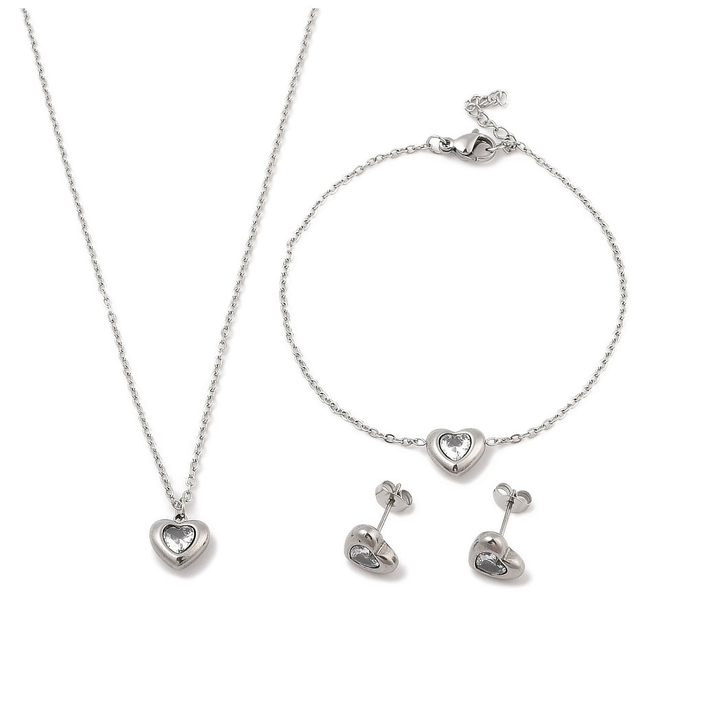 Elegantný dámsky set šperkov z vysoko kvalitnej chirurgickej ocele 304 s jemným dizajnom srdiečok osadených čírym kubickým zirkónom. Set obsahuje retiazku s príveskom, náramok a náušnice – všetky kúsky dokonale ladia do jedného harmonického celku.