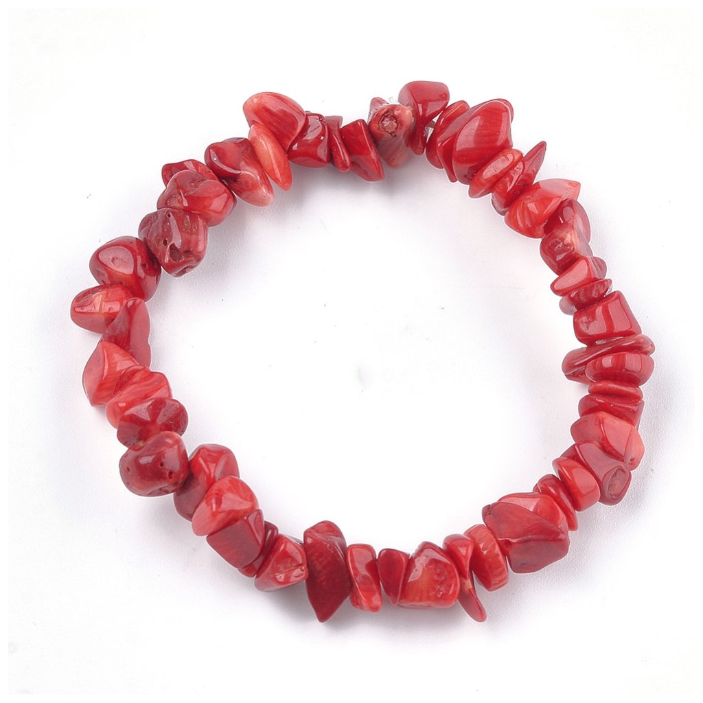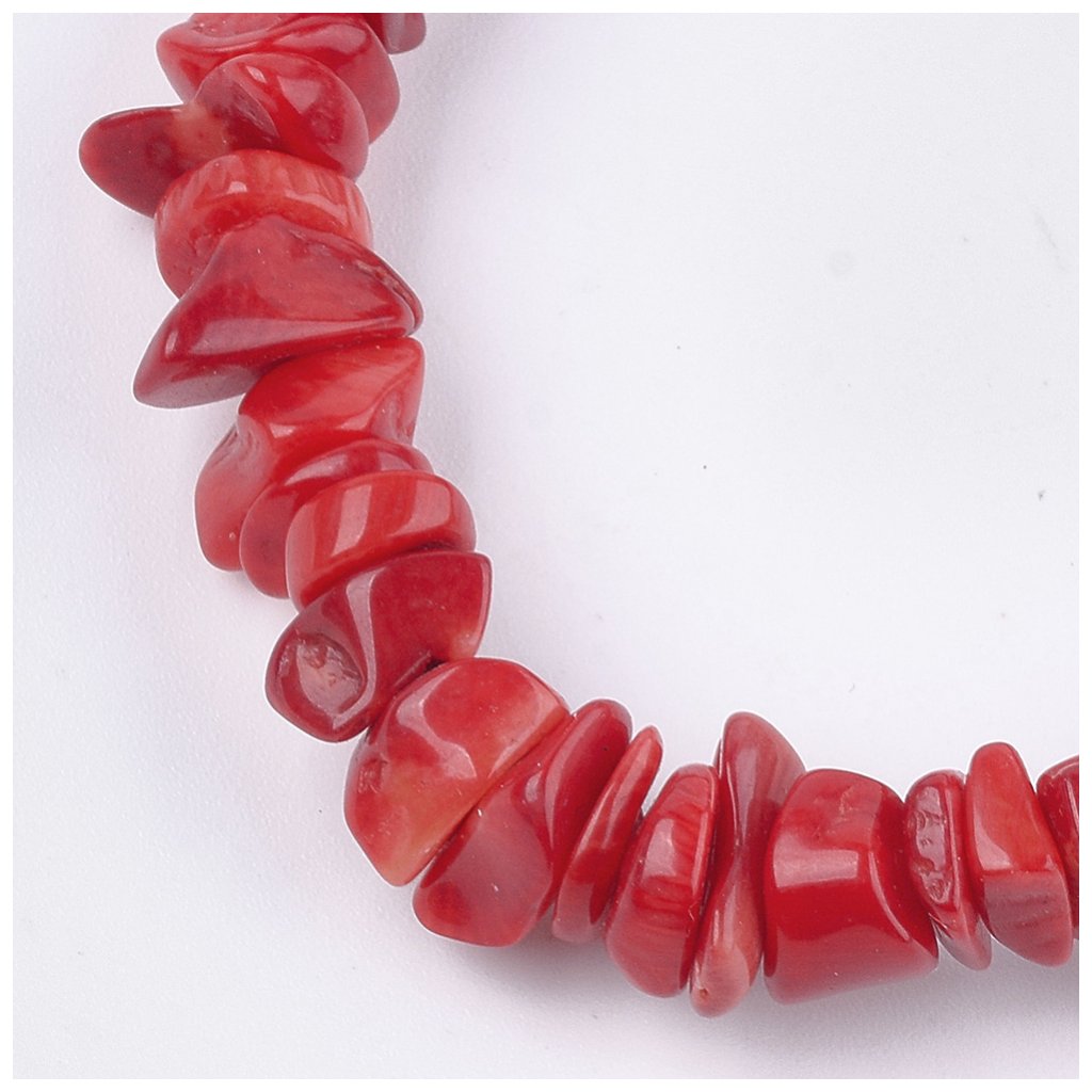 Červený, elastický náramok z korálu. Vďaka pevnej elastickej šnúrke sa prispôsobí tenkému aj hrubšiemu zápästiu.
