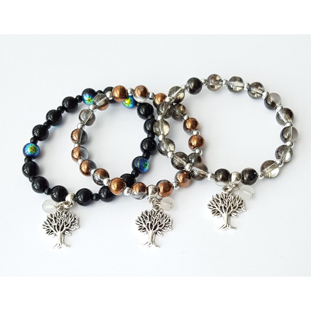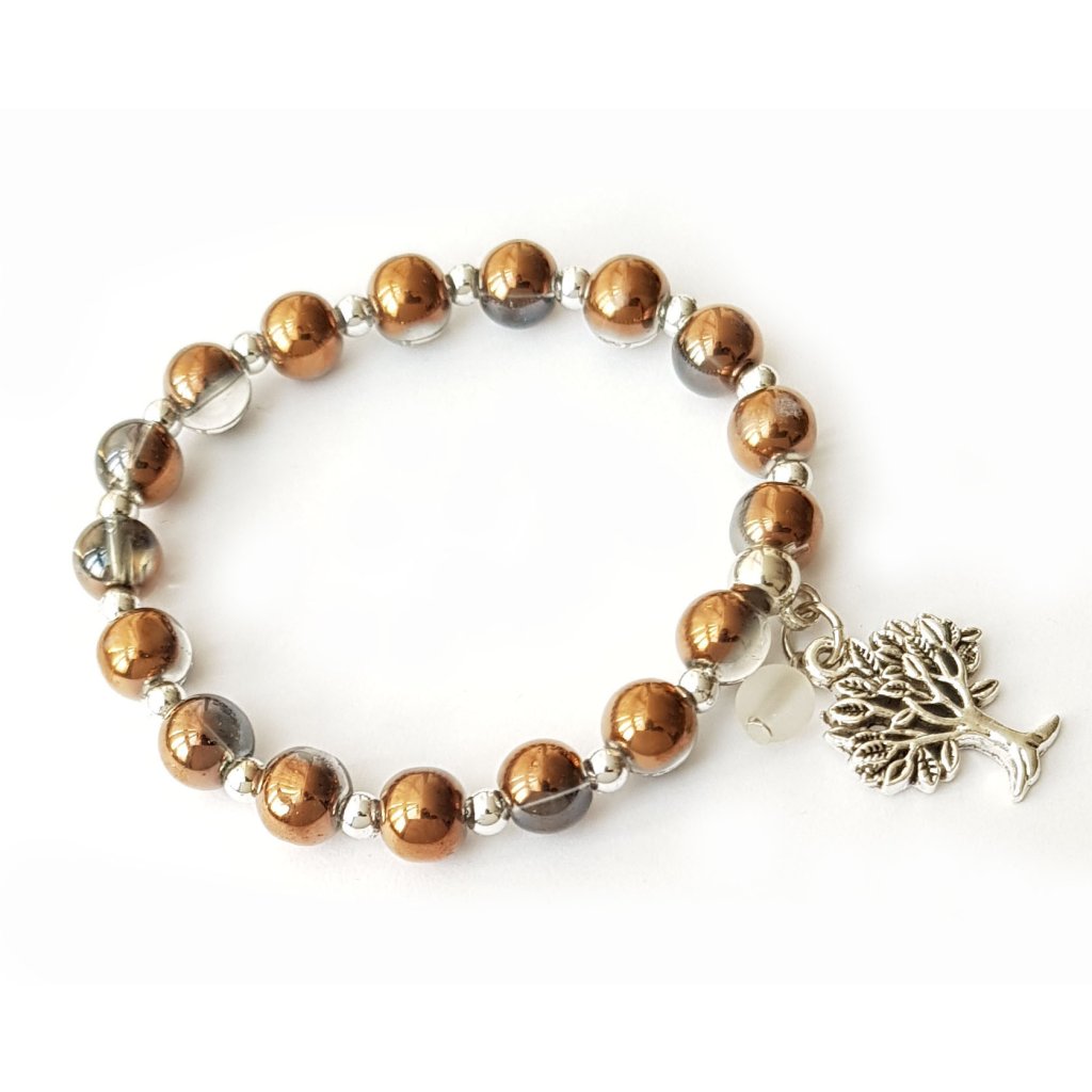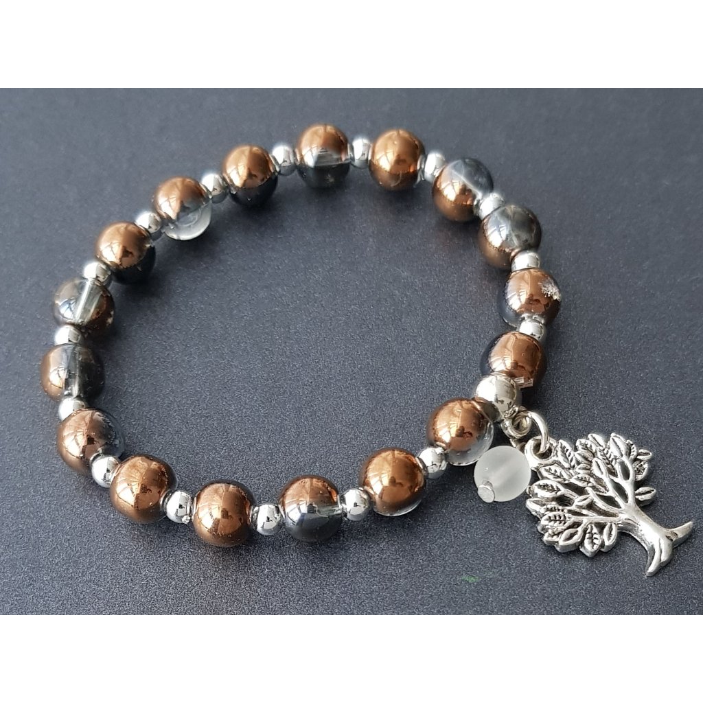 Hnedý, elastický náramok z 8 mm korálok zo skla s krištáľom. Korálky majú výraznú vnútornú štruktúru, ktorá odráža slnečné lúče na všetky strany a ligoce sa na nich rôznymi farbami. Náramok je vďaka lesku veľmi elegantný.