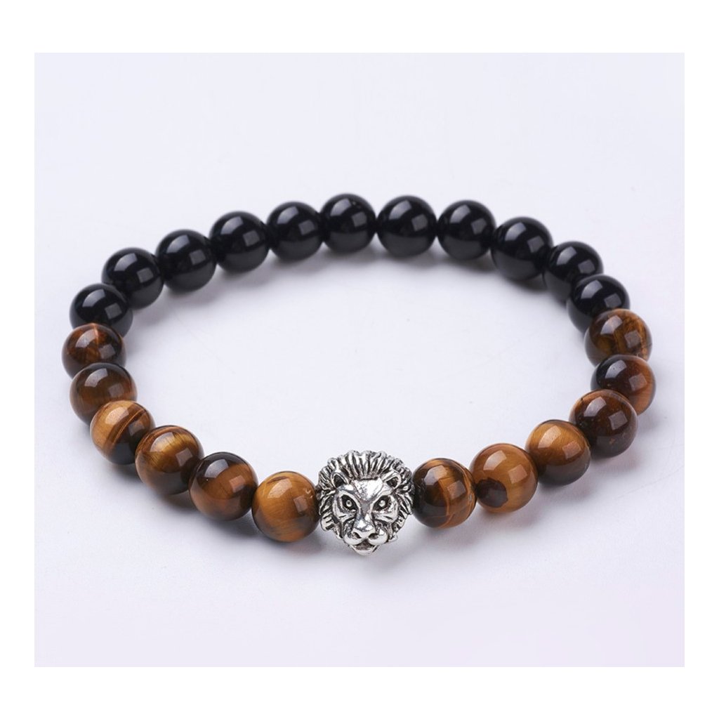 Náramok je tvorený korálikmi z polodrahokamov obsidián a tigrie oko doplnený hlavou leva. Vďaka elastickej šnúrke je vhodný na každé zápästie.