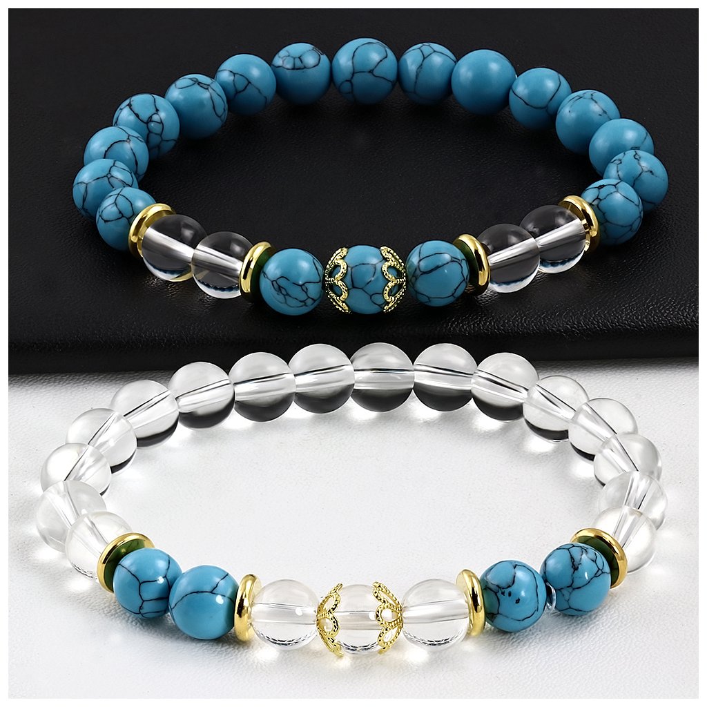 Partnerské náramky sa skladajú z čírych a tyrkysových guľôčkových korálok. Vďaka okrúhlym metalickým krúžkom zlatej farby a celkovému farebnému usporiadaniu tvoria náramky zaujímavý celok a vyniknú tak ma každej ruke.