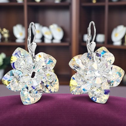 Strieborné náušnice visiace s krištáľmi Swarovski crystal aurore boreale kvety Ag 925/1000 Rh 1 g