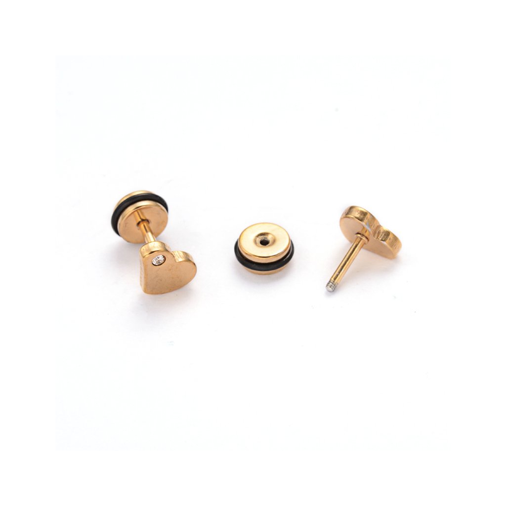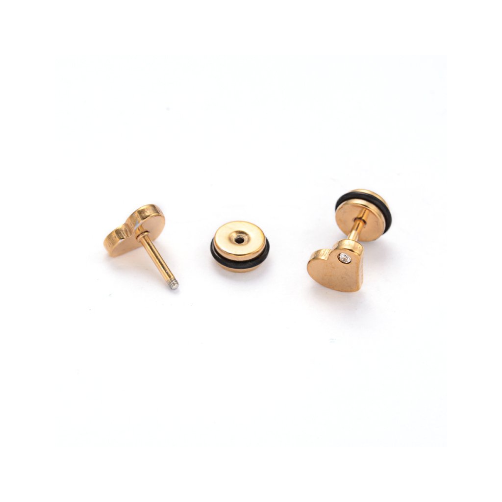 Šrobovacie náušnice srdiečko so zirkónom v zlatom prevedení z chirurgickej ocele