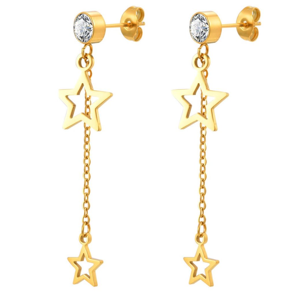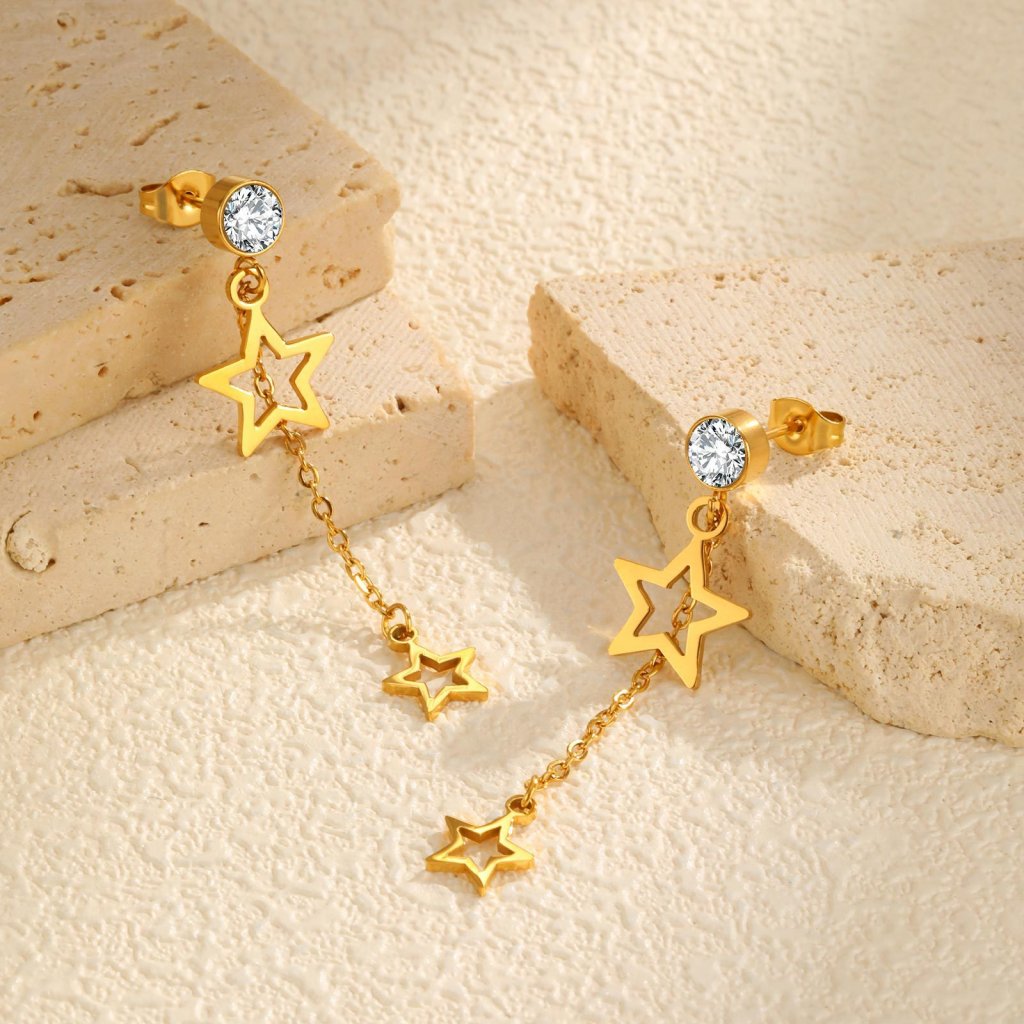 Rozžiarte svoj outfit týmito štýlovými visiacimi náušnicami v tvare hviezd. Vyrobené sú z kvalitnej chirurgickej ocele, ktorá je hypoalergénna, odolná voči poškriabaniu a nestráca svoj lesk ani po rokoch nosenia.