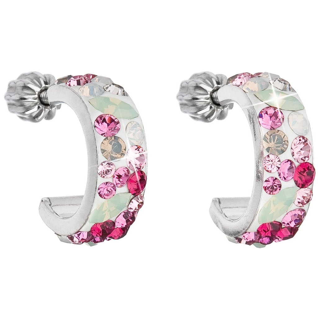 Ideálna veľkosť tvar a rozmer. Obľúbené dámske náušnice polkruhy s bezpečnostným šrubovacím zapínaním, vykladané farebnými krištálikmi MADE WITH SWAROVSKI CRYSTALS. Šperk si zachováva svoju farbu, lesk, je odolný proti sčernaniu a má dlhú životnosť. Špeciálnou metalickou úpravou bol dosiahnutý antialergický účinok. Tento šperk Vám zabezpečí primeranú dávku exkluzivity.