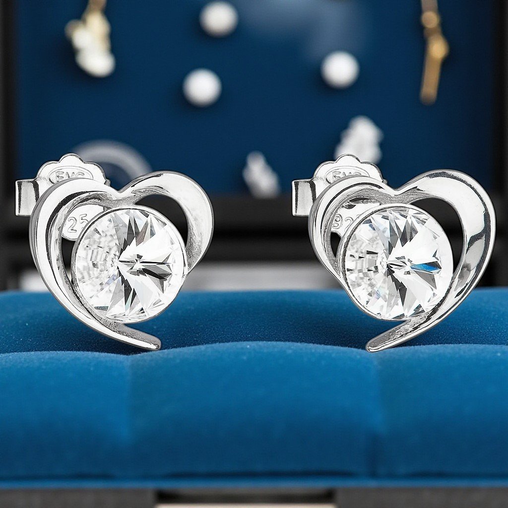 Moderné elegantné strieborné dámske náušnice. Obľúbený tvar srdca vykladaný krištálikmi. Náušnice sú vyhotovené v kombinácií s krištálikmi MADE WITH SWAROVSKI CRYSTALS. Ich pestrosť je očarujúca, na svetle sa nádherné ligocú. Tento model ťa dostane. Jeho majiteľka bude nádherná. Šperk si zachováva svoju farbu, lesk, je odolný proti sčernaniu a má dlhú životnosť. Špeciálnou metalickou úpravou bol dosiahnutý antialergický účinok. Do náušníc nie je pridaný nikel a preto je tento produkt vhodný aj pre alergikov. Tento šperk Vám zabezpečí primeranú dávku exkluzivity.