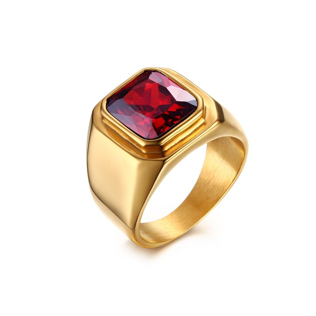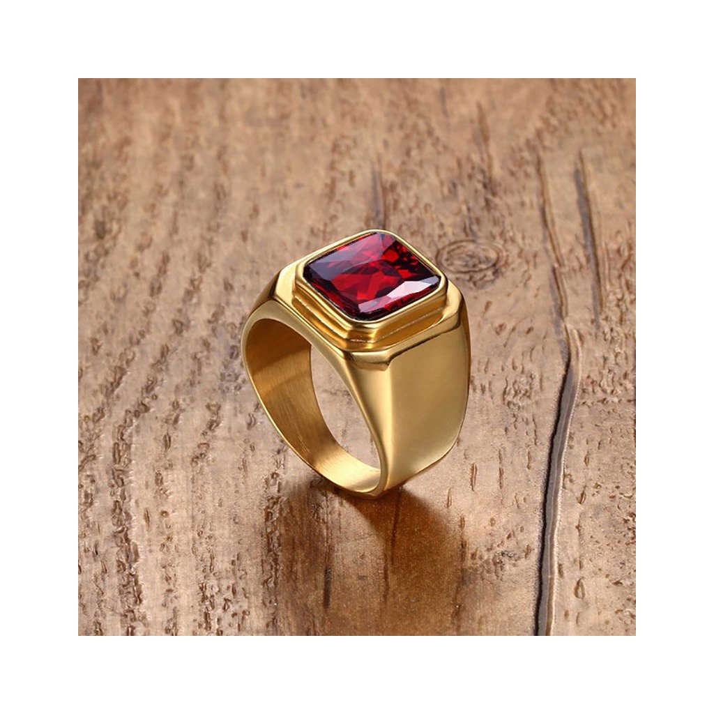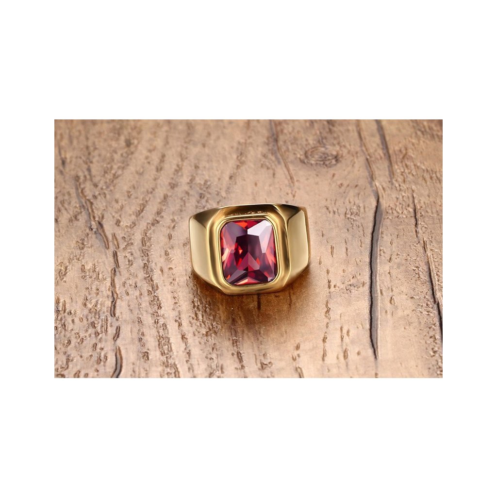 Masívny prsteň z chirurgickej ocele zlaté prevedenie červený štvorcový zirkón