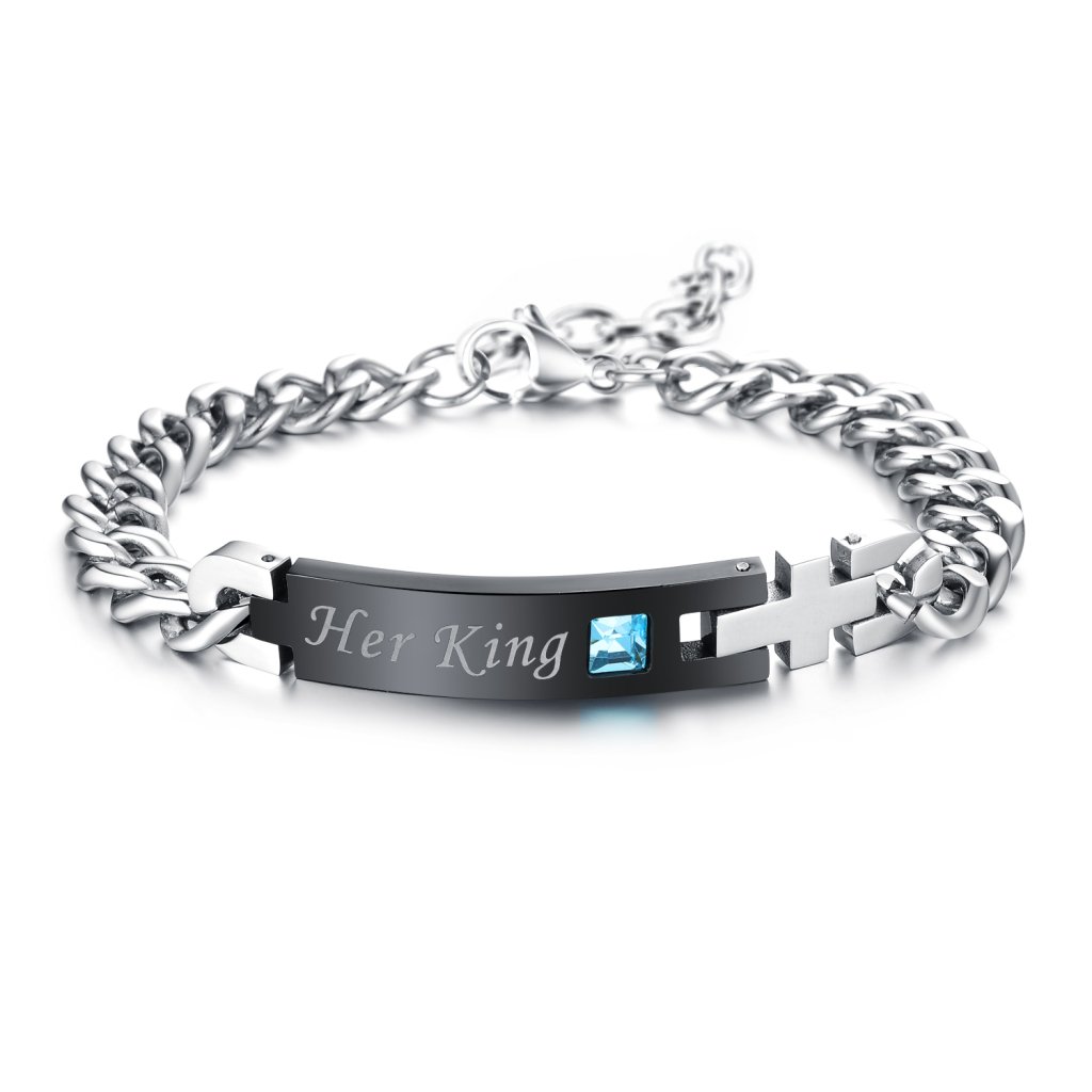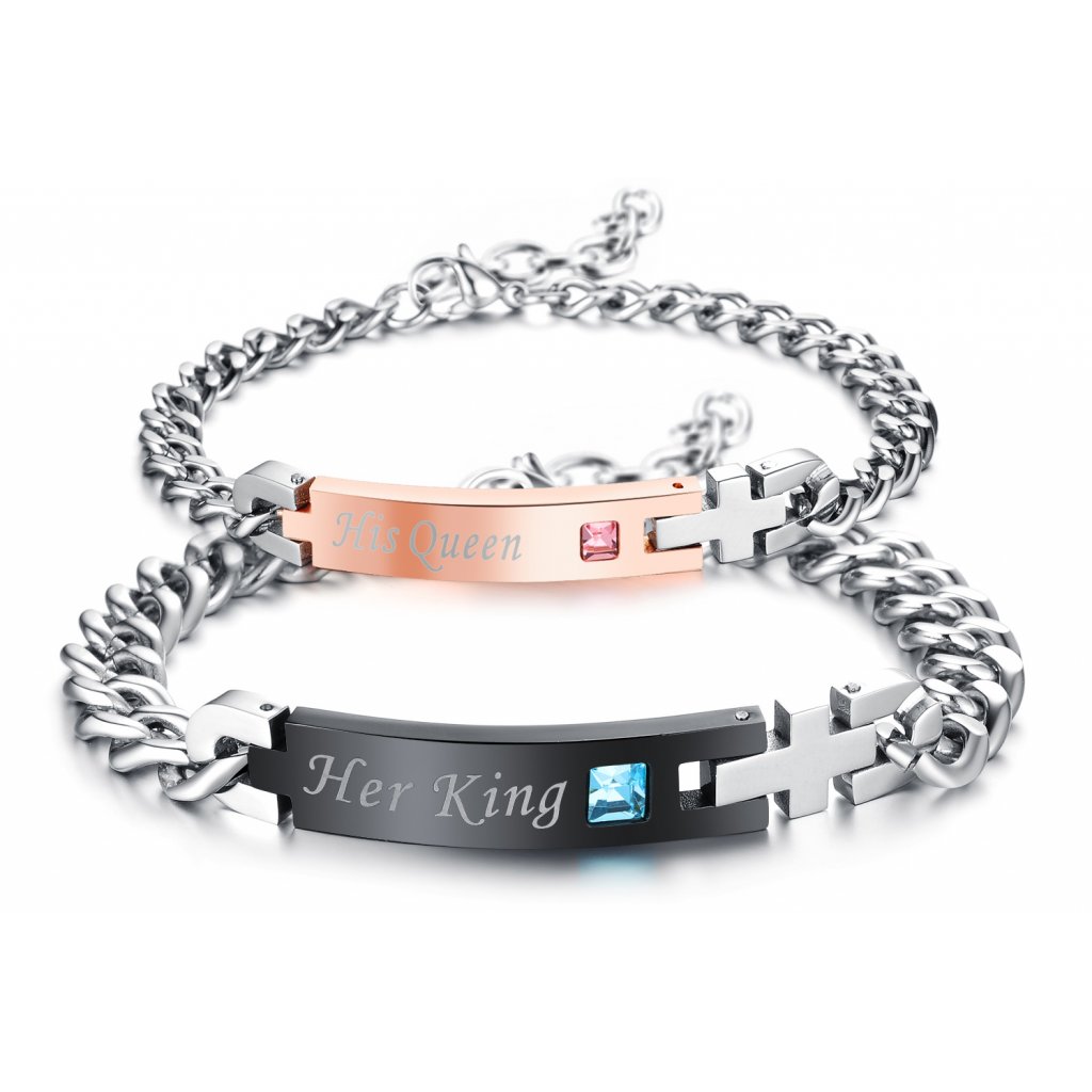 Partnerské náramky s nápisom "Her King" a "His Queen". Dĺžka náramkov je nastaviteľná, pánsky 19 až 23 cm, dámsky 16 až 19,5 cm. Objednajte si ešte dnes 2 náramky za 1 cenu. Náramky sú vyrobené z kvalitnej chirurgickej ocele s očarujúcim leskom a navyše zabalené v štýlovej darčekovej krabičke. Chirurgická oceľ 316 L patrí vďaka svojim vlastnostiam medzi najvhodnejšie materiály na výrobu šperkov. Tie najdôležitejšie sú vysoká tvrdosť - materiál má vysokú tvrdosť, neohýba sa ani neláme, farebná stálosť - nedochádza k zmene farieb spôsobených vplyvom svetla a odolnosť povrchu - povrch je odolnejší voči poškriabaniu než striebro či zlato.