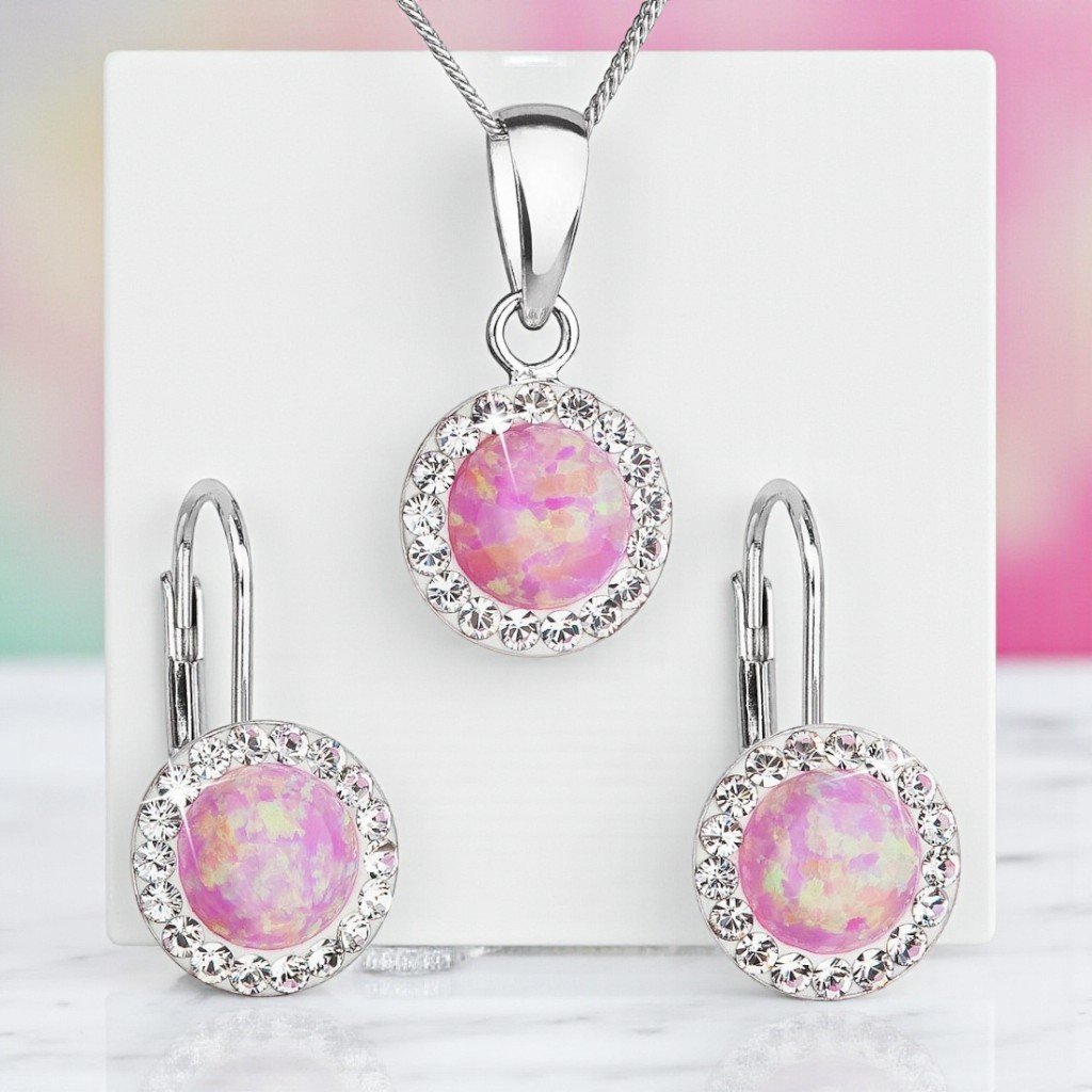 Prívesok a náušnice so synt. opálom a Preciosa crystals - ružová Ag 925/1000 Rh (2g)